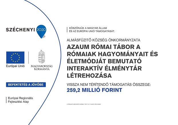 Az AZAUM RÓMAI TÁBOR a rómaiak hagyományait és életmódját bemutató interaktív élménytár létrehozása során kulturális örökségi helyszín turisztikai fejlesztése valósul meg az épített és szellemi örökség értékeinek hasznosításával, -kiállító és bemutatóterek, többfunkciós helyiségek, vendégfogadó terek, foglalkoztatók kialakításával, -interaktív kiállítással és eszközbemutatóval, –
